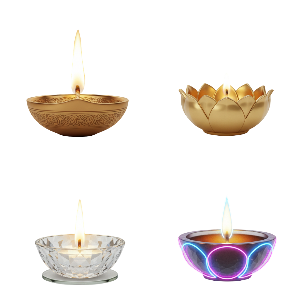 - 🪔 Brass Diya – traditional golden shine with soft reflections.