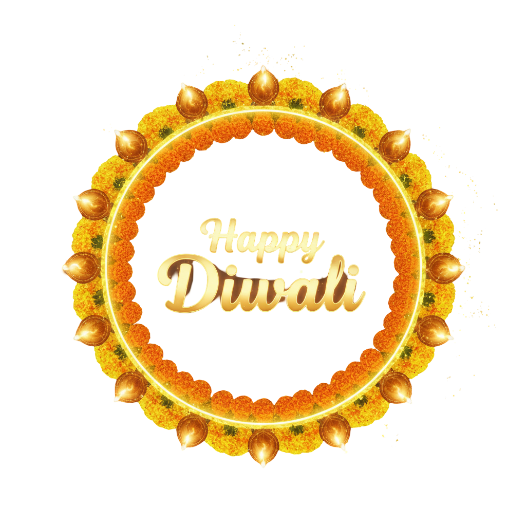 Celebrate the Festival of Lights with this exquisite 3D glowing circular frame decorated with traditional diyas and vibrant marigold garlands. Featuring “Happy Diwali” in a luxurious golden font, this high-quality transparent PNG is perfect for enhancing your festive creations.