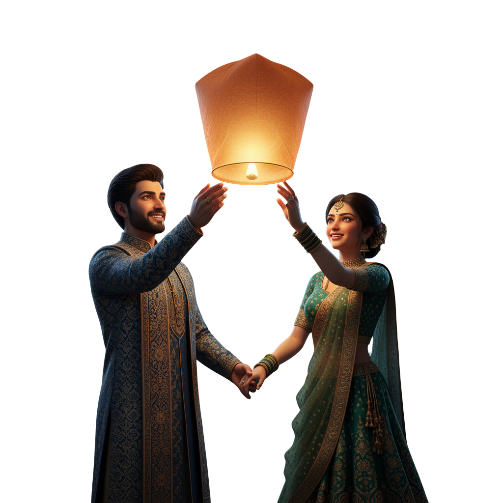 3D Indian Couple Diwali Sky Lantern PNG Free Download