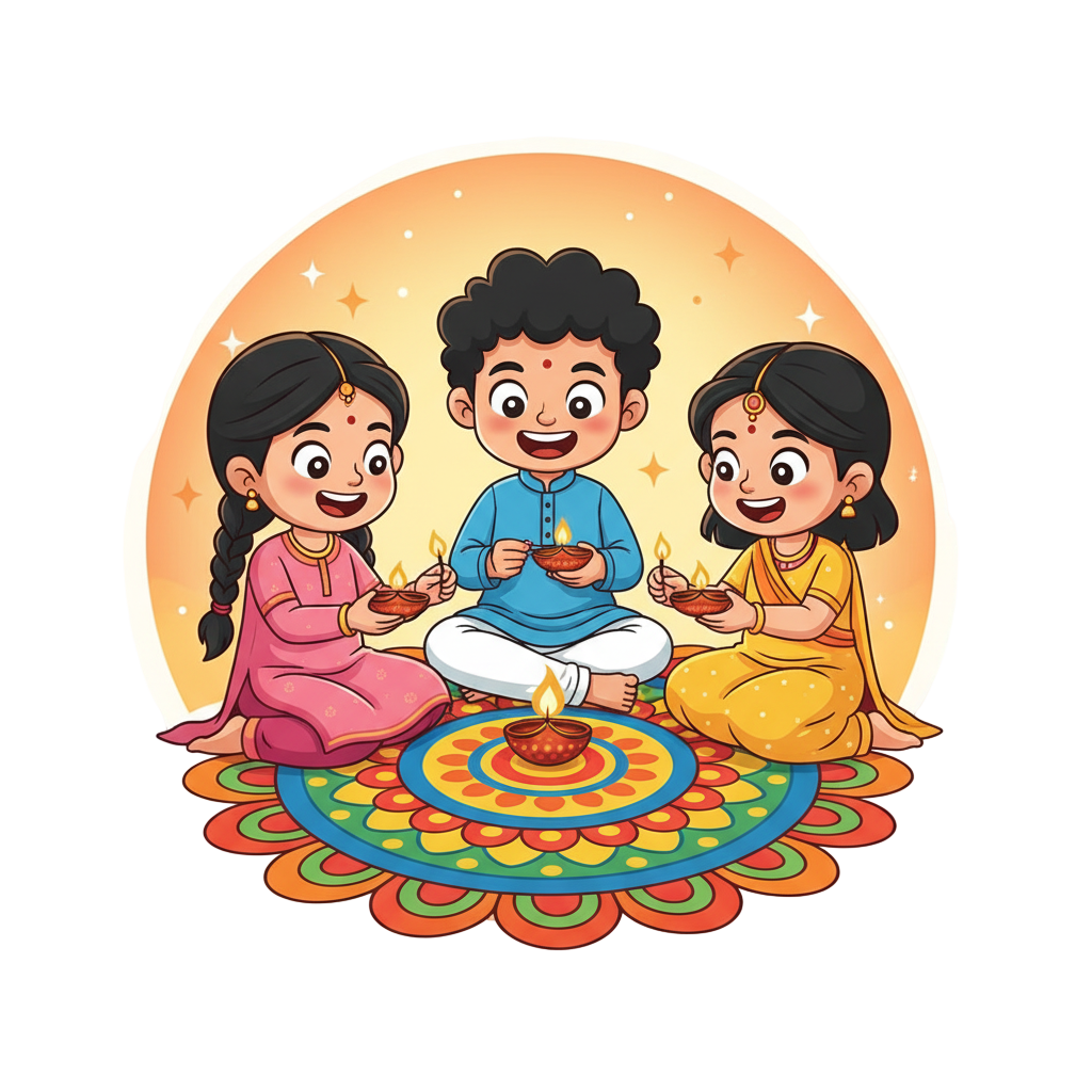 Celebrate the joy of festivals with this cute cartoon clipart of three Indian children in ethnic clothes, sitting together and lighting diyas. The artwork features a colorful rangoli design beneath them, symbolizing warmth, tradition, and festivity. Perfect for designing Diwali greeting cards, banners, posters, or social media visuals.