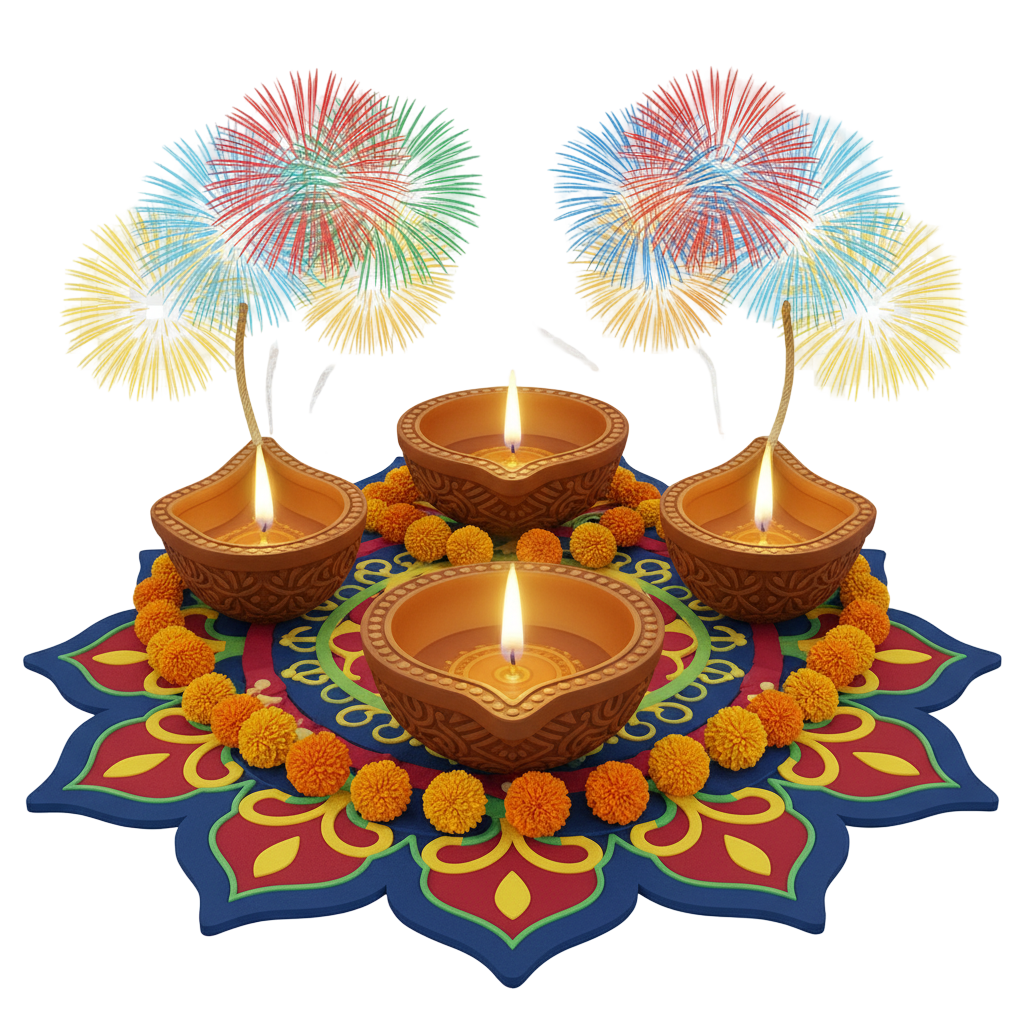✨ Ultra Realistic Diwali Diya PNG – Golden Glow with Rangoli & Fireworks