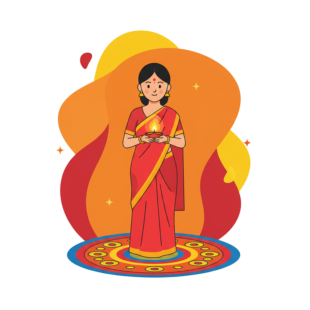 A beautiful Diwali illustration PNG can instantly enhance your festival designs. This unique clipart features a minimal cartoon-style Indian woman in a red saree holding a glowing diya, placed above a decorative rangoli with a festive background. Designed with bright colors and a transparent background, this illustration is perfect for Diwali cards, posters, social media posts, and cultural projects.