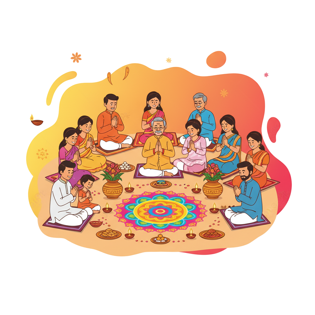 Diwali Pooja Vector Clipart is a perfect way to add festive spirit to your creative projects. This collection features Indian couples and families sitting cross-legged performing pooja with kalash, diyas, rangoli, flowers, and sweets.