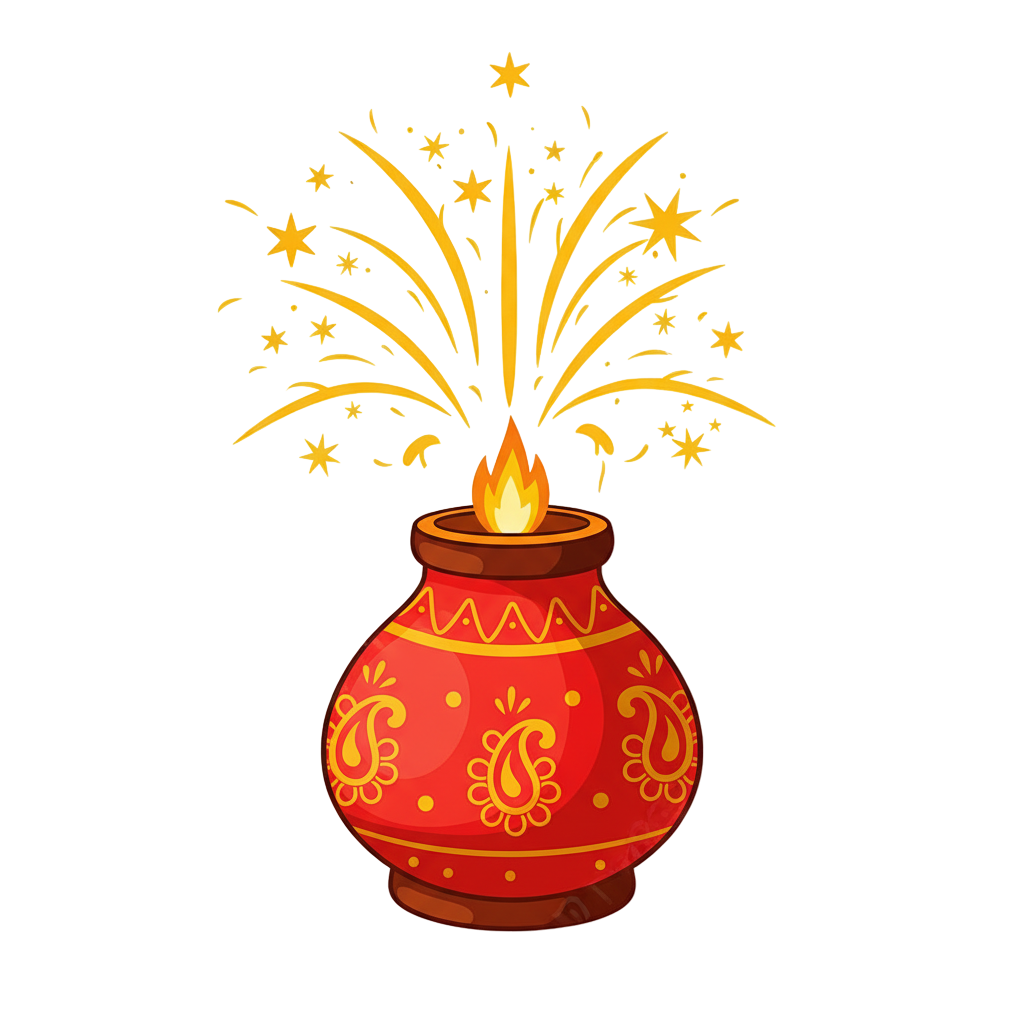 Celebrate the festival of lights with this flat cartoon Anar PNG featuring a glowing tip and sparkling sparks flying upwards. Designed with bright colors and intricate gold ornamental patterns, this free transparent PNG is perfect for all your Diwali projects.
