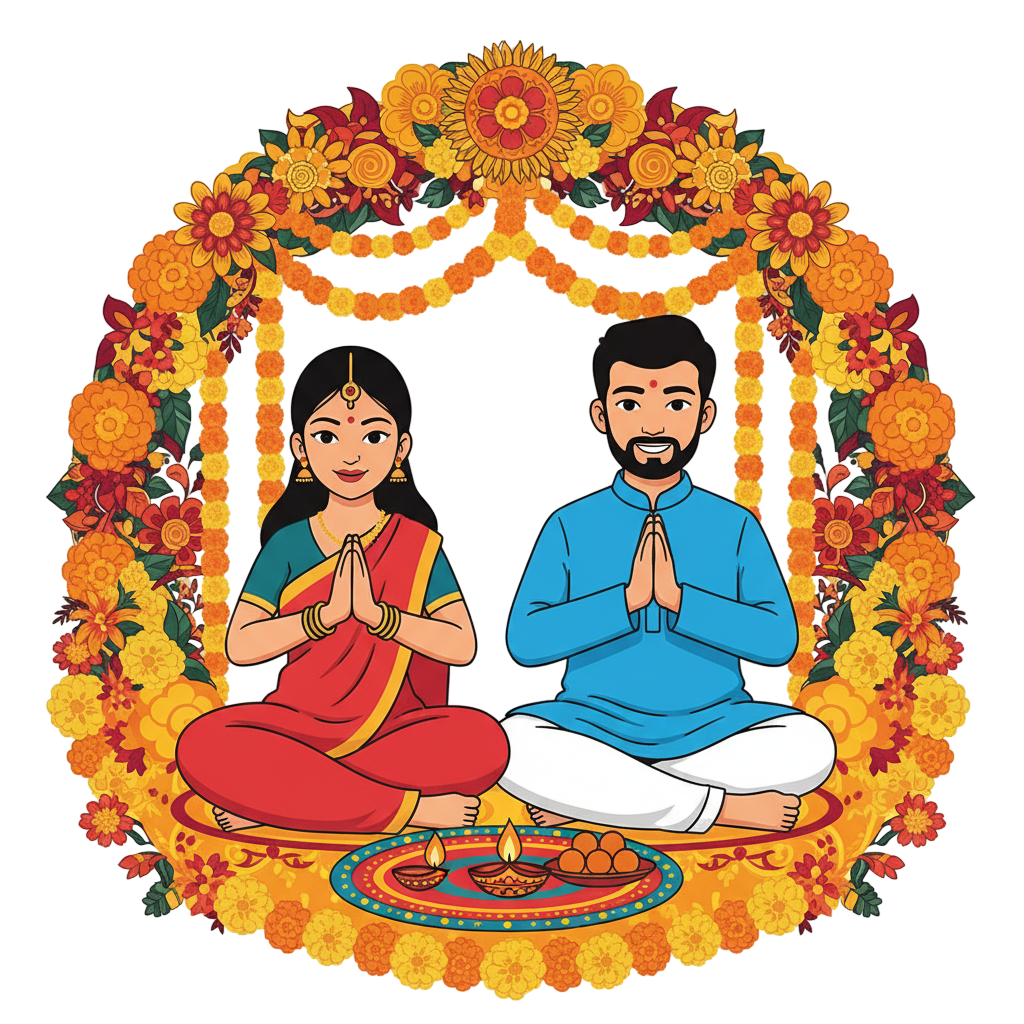 Celebrate Indian tradition and spirituality with this beautiful vector clipart of an Indian couple performing pooja. The artwork features decorative floral patterns, marigold garlands, glowing diyas, and festive sweets, capturing the essence of Indian festivals like Diwali, Navratri, Karva Chauth, and weddings.