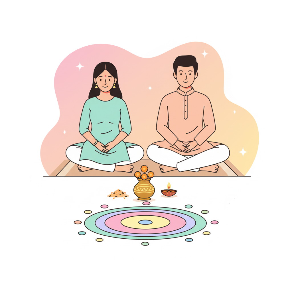 This Indian couple vector clipart brings a beautiful and festive aesthetic to your creative projects. The design shows a couple sitting cross-legged with a small kalash, single diya, and flowers, placed above a simple geometric rangoli pattern.