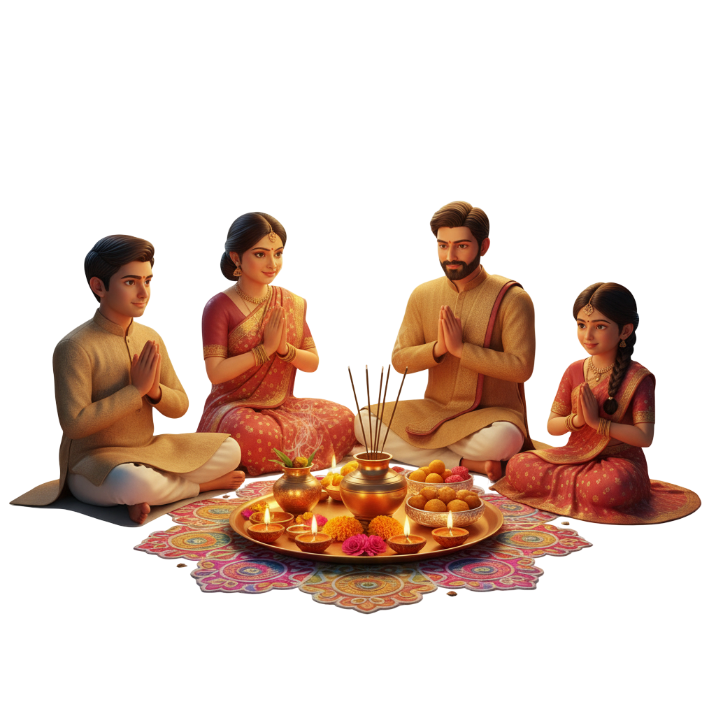 3D Indian Family Diwali Pooja PNG Free Download | Festival Worship Scene Transparent Image