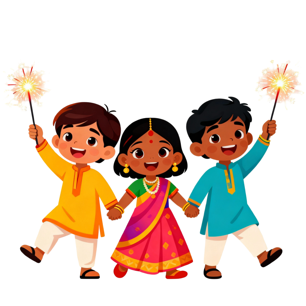 Celebrate India’s favorite festivals with this Indian kids holding sparklers PNG — a vibrant, cartoon-style vector clipart that captures the joy of childhood and the sparkle of Diwali.