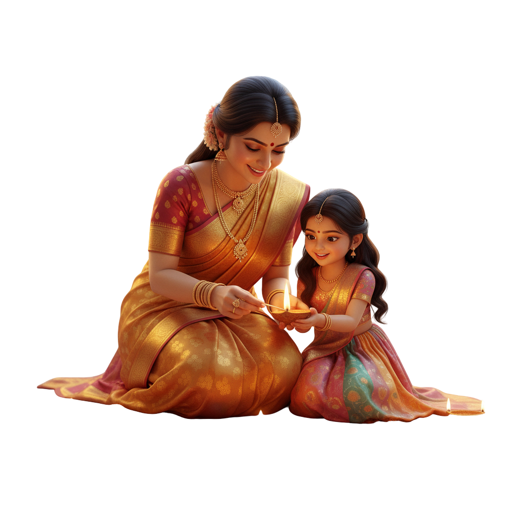 Indian Mother and Daughter Lighting Diyas PNG Free Download | 3D Realistic Diwali Image