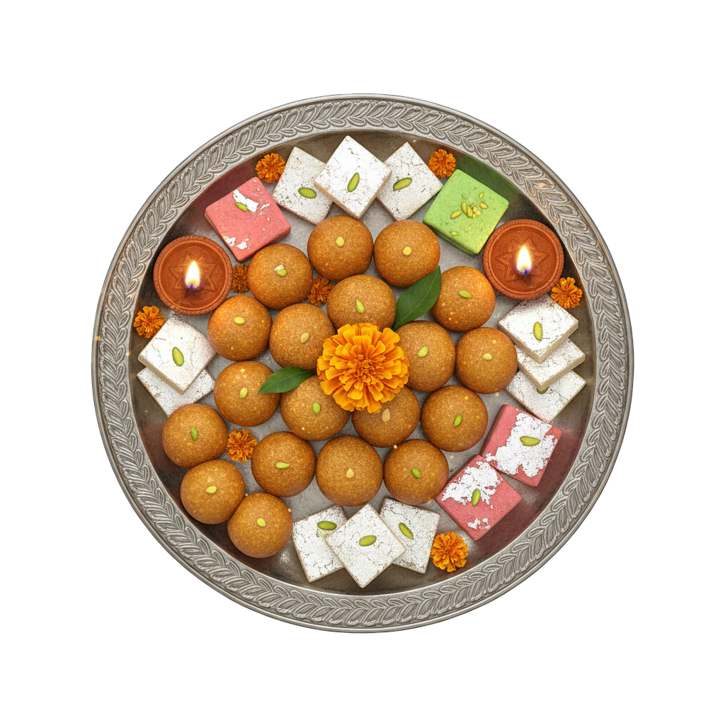 Indian Sweet Plate PNG – Ladoos, Kaju Katli & Barfi with Diyas and Flowers