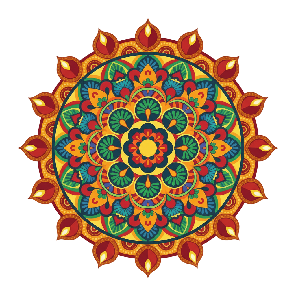 Add a festive touch to your digital and print designs with this large circular Rangoli PNG. Featuring vibrant floral and geometric patterns, this vector clipart includes diyas around the edges, making it ideal for Diwali, Navratri, or other cultural celebrations. Its transparent background ensures easy integration into Instagram and Facebook banners, posters, and creative templates.