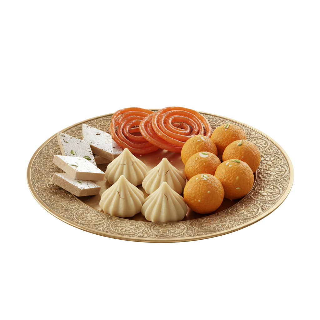 Photorealistic Indian Sweets PNG is the ideal image for bringing authentic festive vibes to your creative projects. This high-resolution PNG features modak, ladoo, kaju katli, and jalebi beautifully arranged on an ornate brass plate with realistic reflections and warm soft lighting.