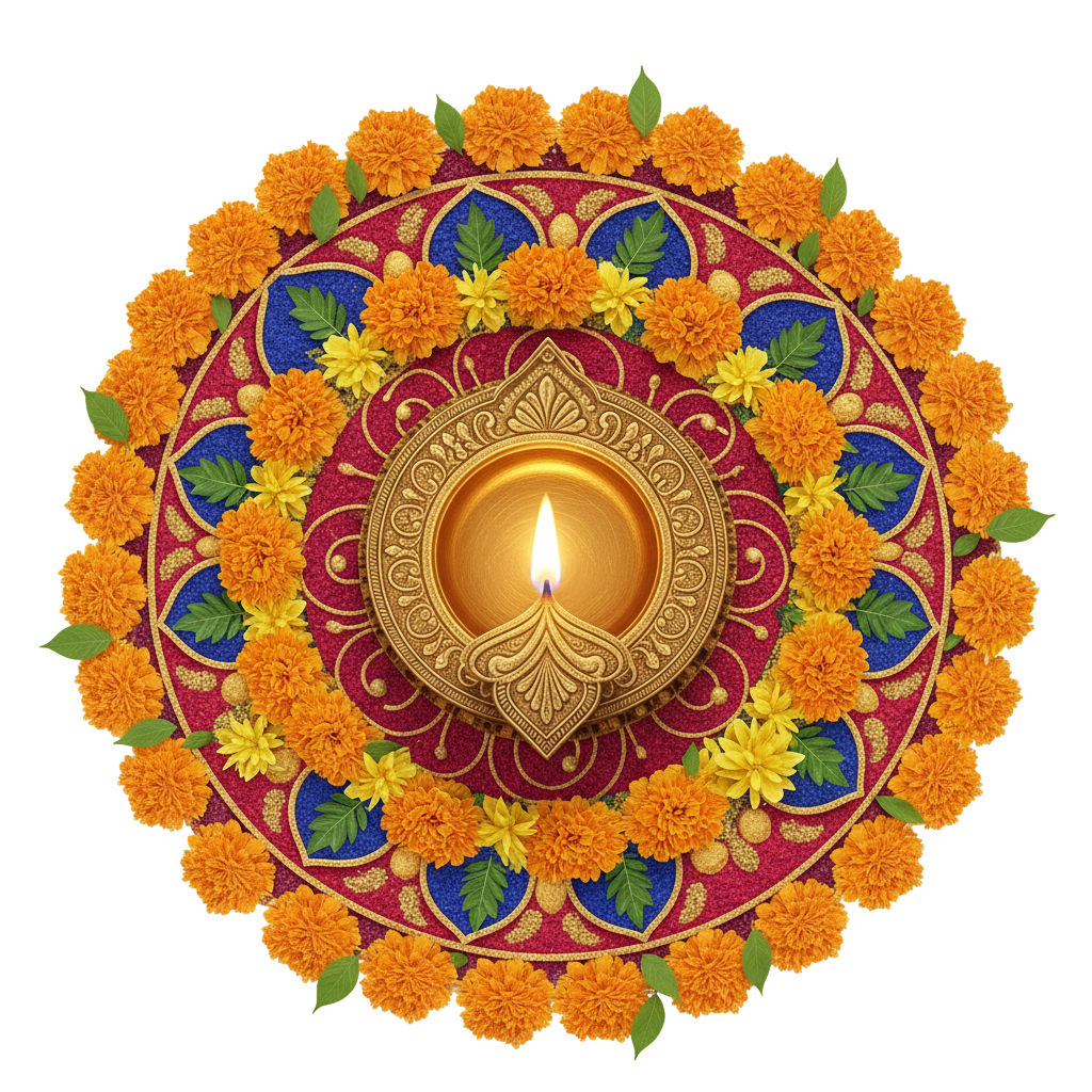 Celebrate the spirit of Diwali with this realistic diya PNG — a 3D glowing lamp beautifully placed on a floral rangoli made of marigold petals and colored powders. The soft, natural flame and premium lighting create a lifelike effect, making it ideal for digital artworks and festive design projects.