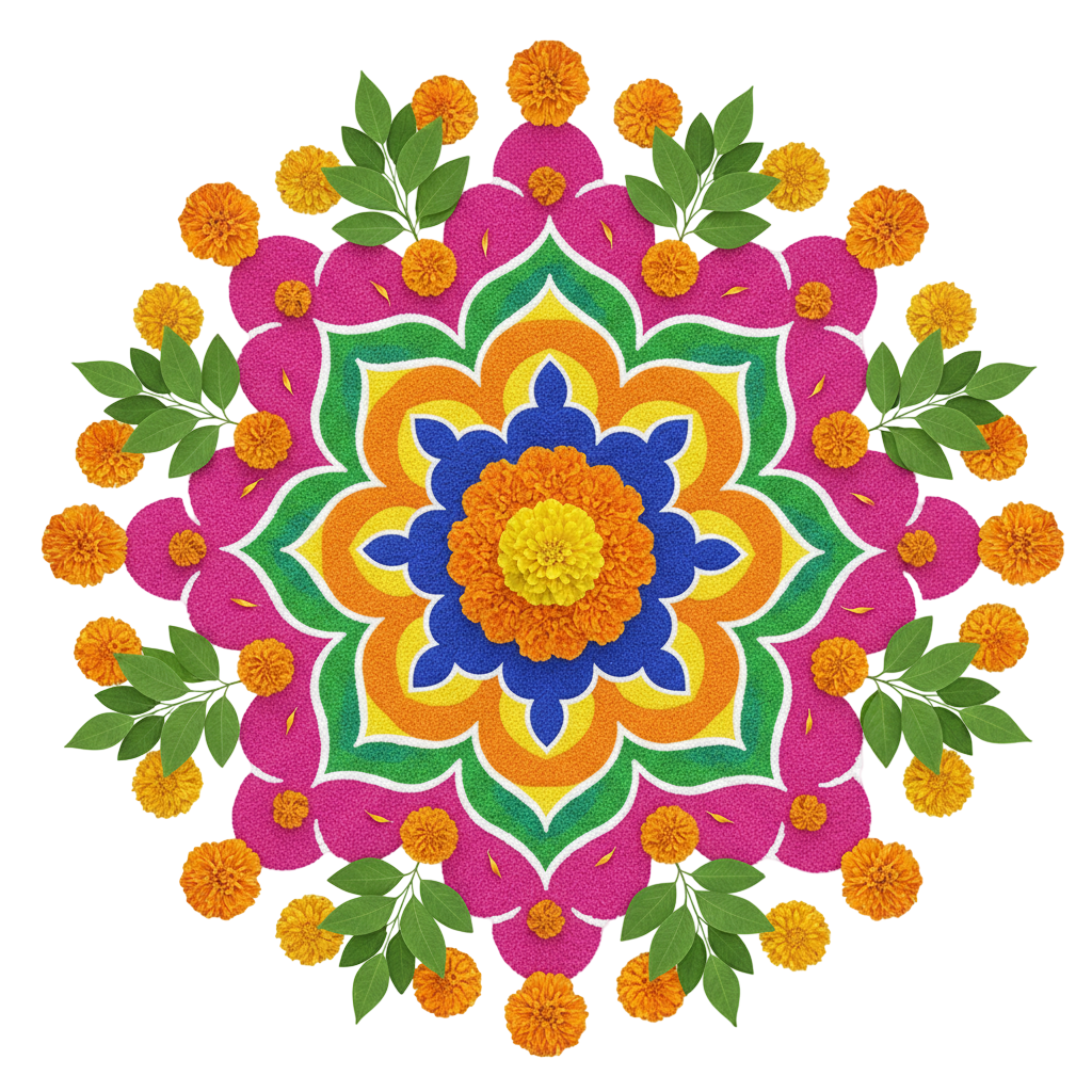 This ultra-detailed Rangoli PNG features a stunning circular powder design with floral decorations and vibrant festive colors. Rendered in 4K transparent background, this PNG is ideal for: