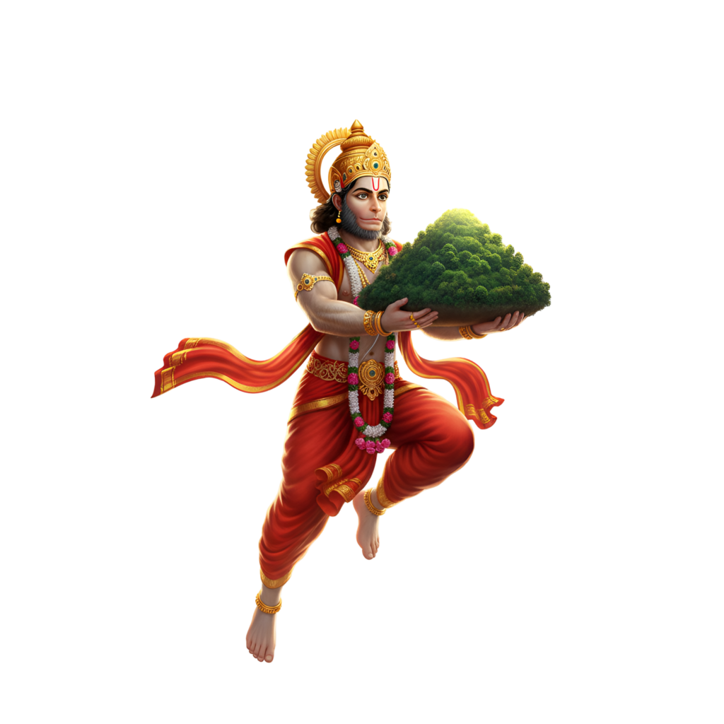 Download Hanuman Ji 3D PNG Transparent – hyper realistic render of Hanuman Ji flying in the sky holding a mountain, red dhoti fluttering, golden crown glowing, and divine aura surrounding. Perfect 4K PNG for devotional posts, wallpapers, and digital artwork.