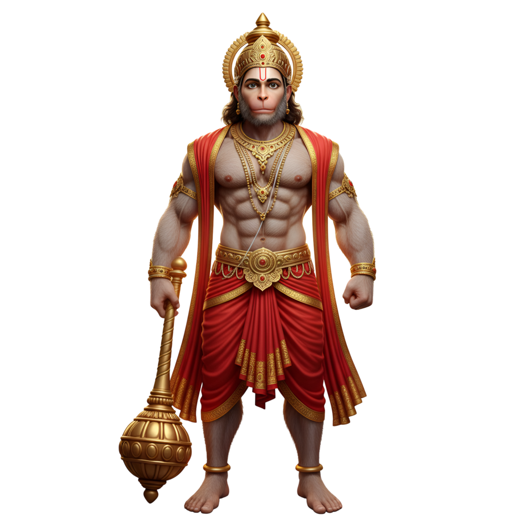 Celebrate the divine strength of Hanuman Ji 3D PNG Transparent with this ultra realistic render. Hanuman Ji is depicted standing tall with a muscular body, holding his gada in the right hand, wearing a red dhoti and golden ornaments shining, with a divine aura behind.